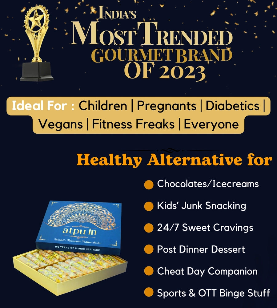 Promotional image of atpu.in sweet boxes with text about their uses.